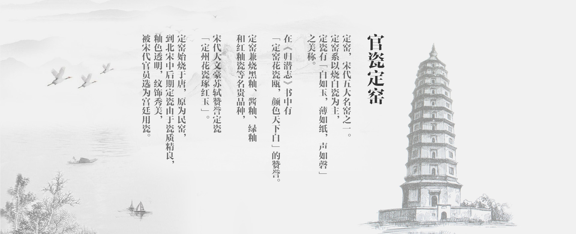 定窯為宋代五大名窯之一,窯址在今河北省曲陽(yáng)澗滋村、野北村及東西燕村,在宋代屬定州,故名。創(chuàng)燒于唐,極盛于北宋及金,終于元。以產(chǎn)白瓷著稱,兼燒黑釉、醬釉和釉瓷,文獻(xiàn)分別稱其為“黑定”、“紫定”和“綠定”。